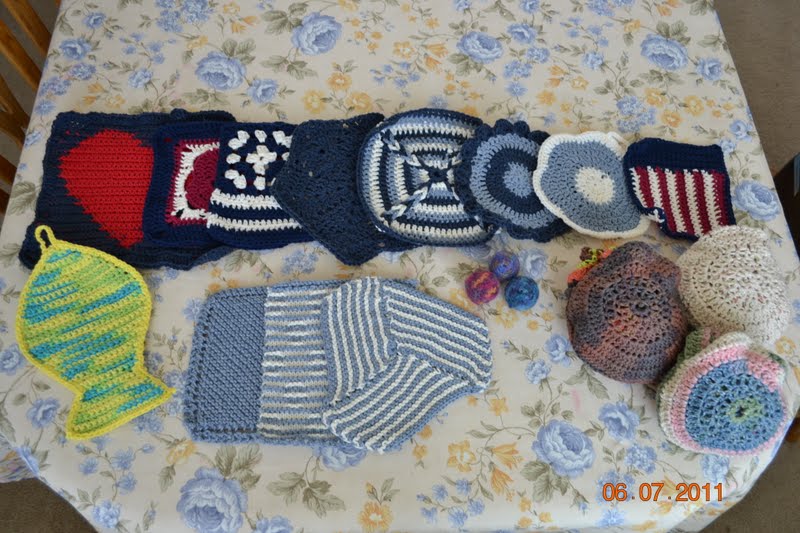 here. The red heart dishcloth I made up to test a technique I read about. The red and white stripe "flag" sort of one came from another website, (and my apologies that I can't find it now), and the rest came from various booklets that I've picked up in the last few years.
